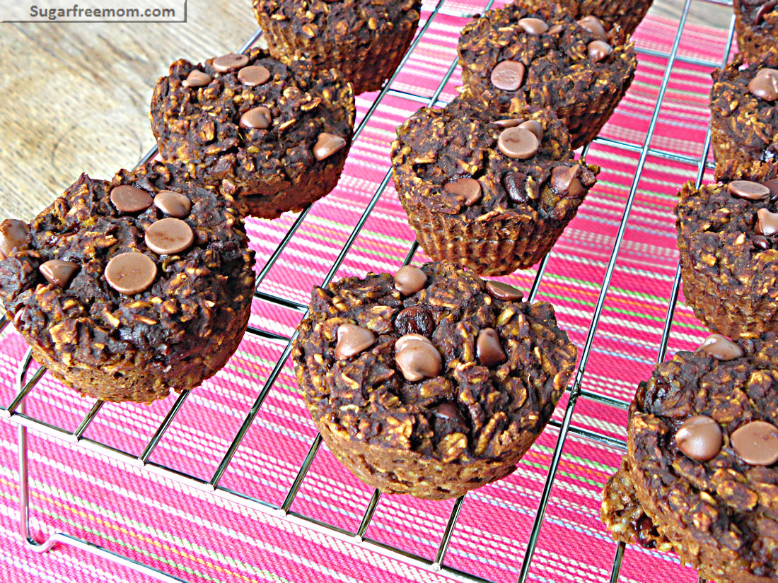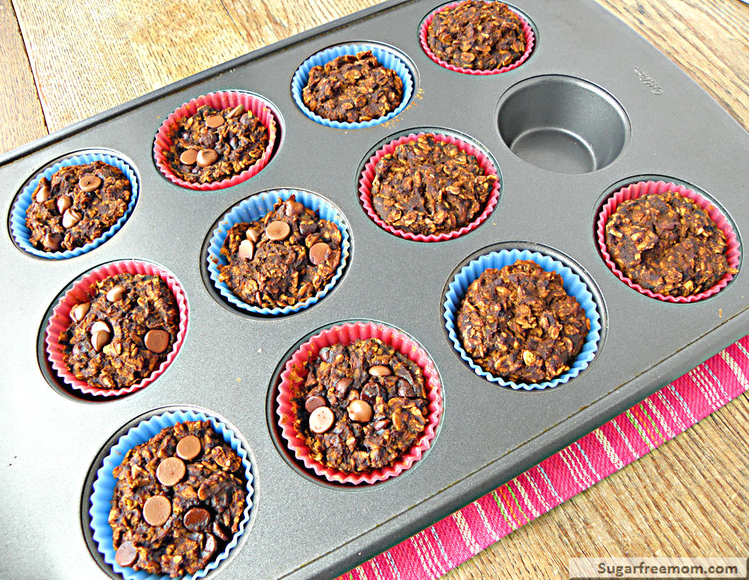 - Preheat oven to 350 degrees. Mix egg, banana, pumpkin, water, and vanilla together in a bowl. Add in oats, cinnamon, cocoa, baking powder, salt, instant coffee, and stevia. Mix well with wet ingredients. Spray a 12 and 6 capacity muffin tin with cooking spray or use cupcake liners. Pour mixture evenly into muffin tin cups. Bake 35 minutes until a toothpick in center comes out clean. Cool and enjoy or freeze them in gallon freezer bags.