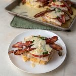 - Transfer each piece to a serving plate, top with 2 pieces of bacon. Serve hot with a fork and knife.