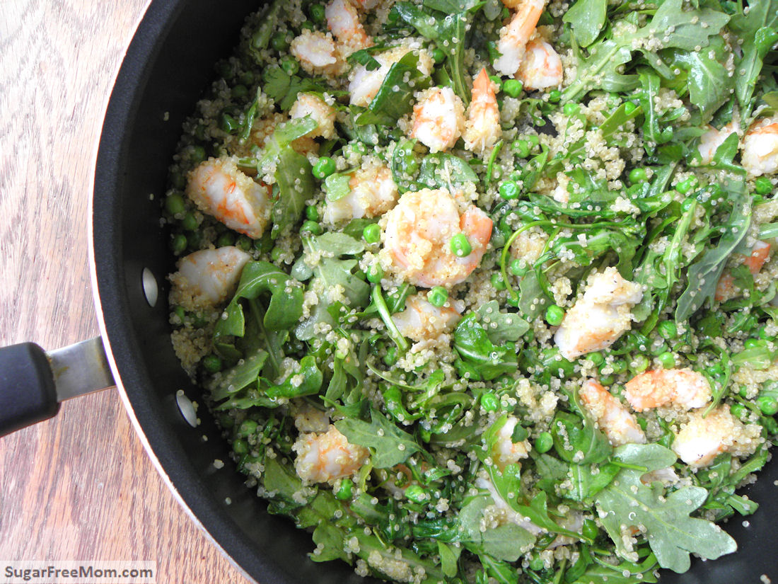Once the shrimp is cooked you add the rest of the ingredients. No need to cook the arugula or frozen peas. Once added to the shrimp and topped with the hot quinoa they will warm right through.