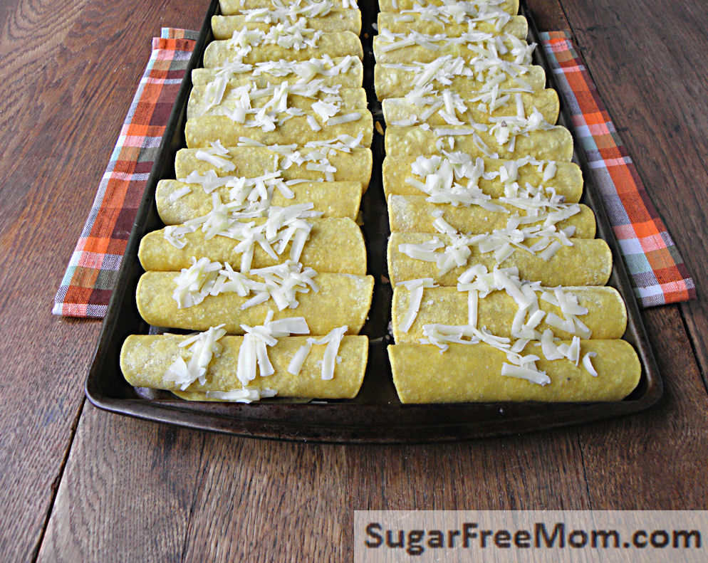 These are made with corn tortillas and filled with an adaption of my Turkey Enchilada recipe then baked until crispy. You won’t even really notice they aren’t fried because they still get nice and crisp!