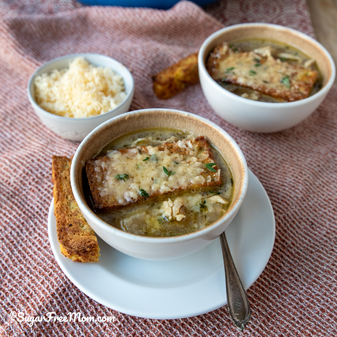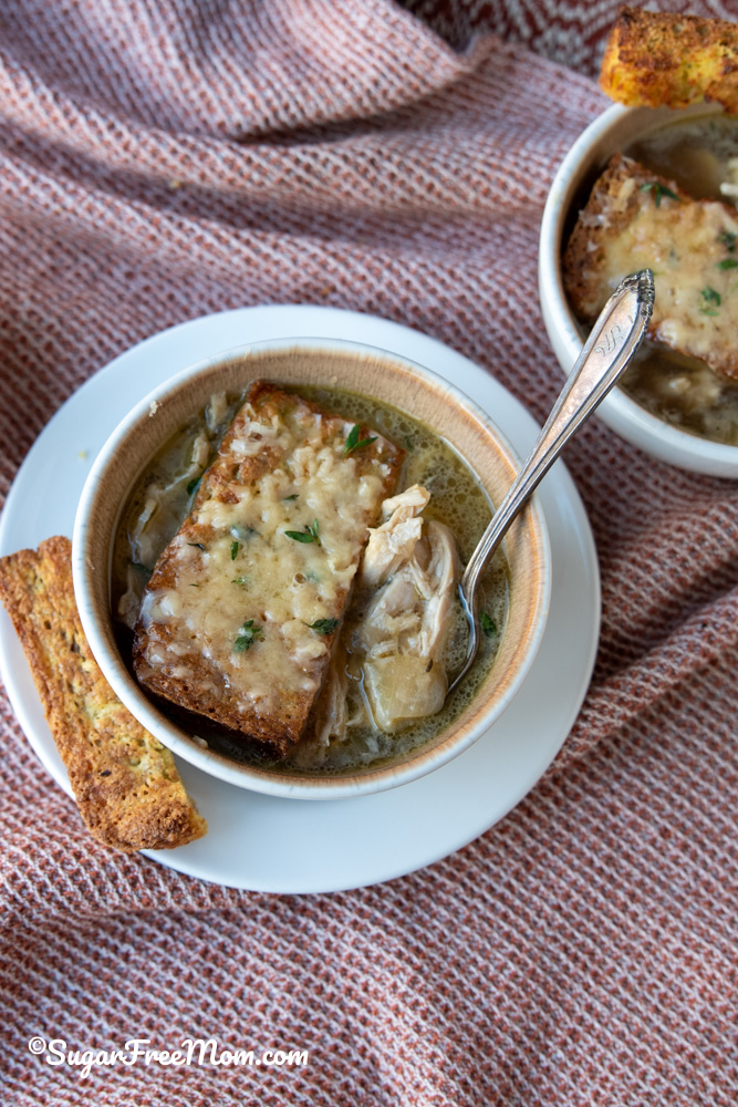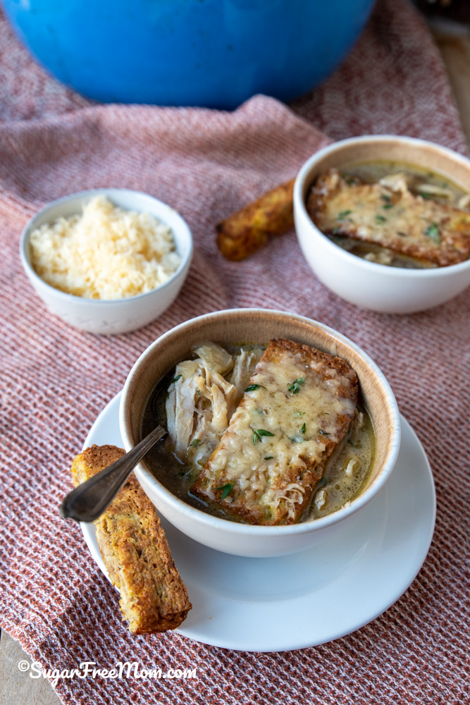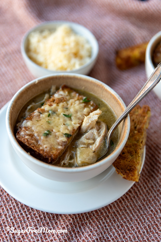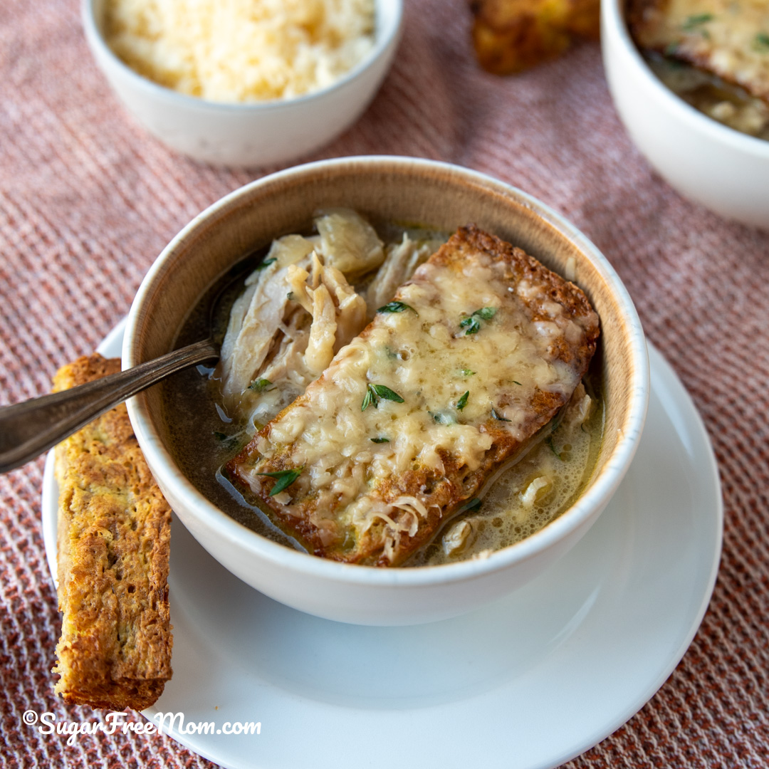 This cozy keto French Onion Chicken soup has 30 grams of protein per serving. It’s a comforting, satisfying and easy recipe for the slow cooker or stove top.