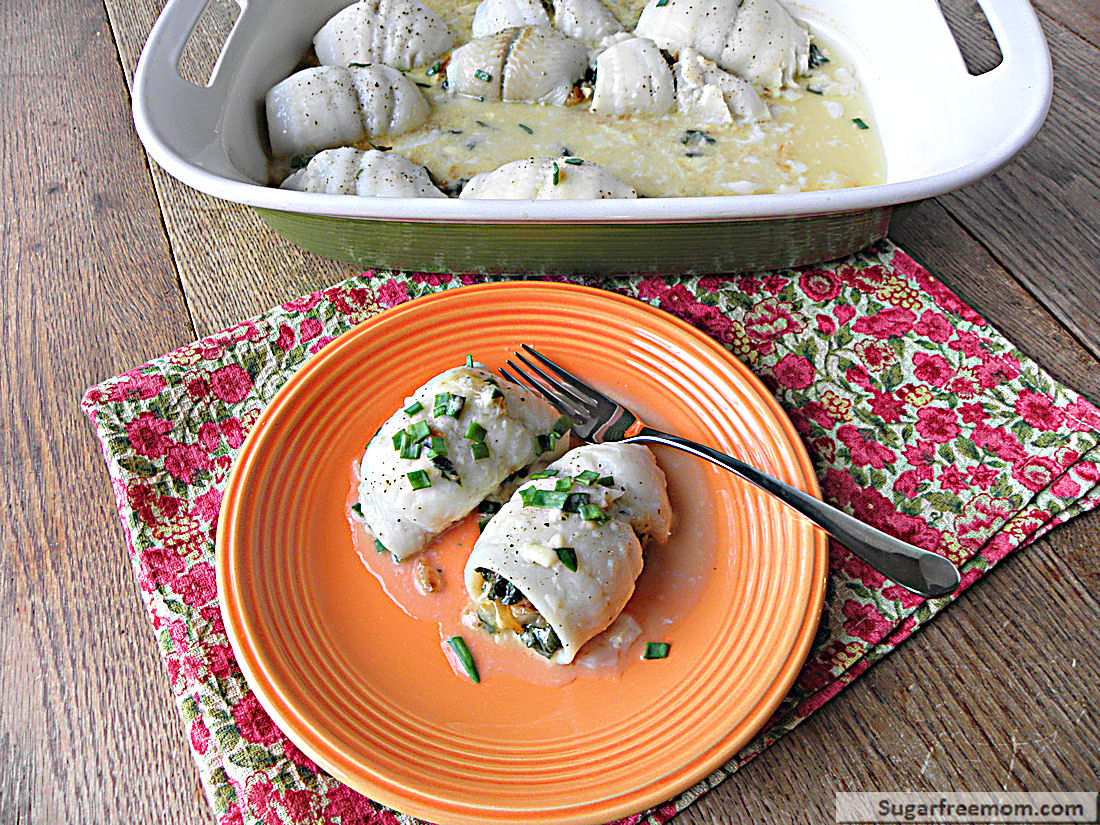 Once baked the spinach and cheese along with the juices from the fish make a nice sauce to pour over each piece before serving. Top with a little parsley or green onions and a wedge of lemon. Enjoy immediately!