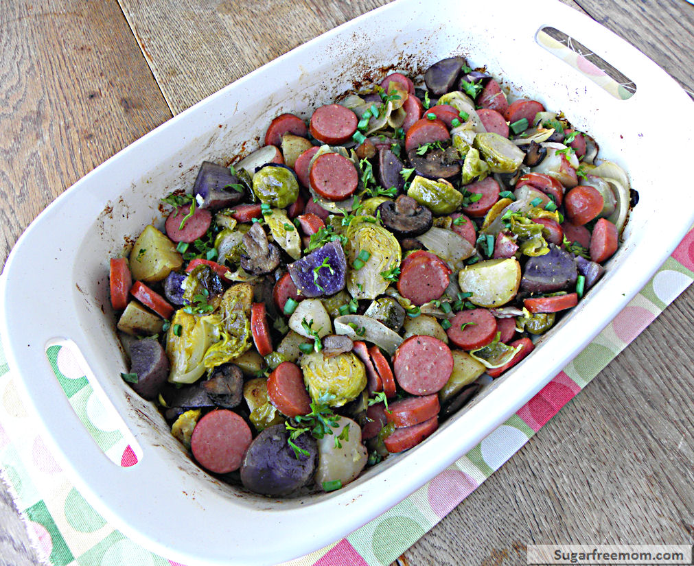 Prepare the veggies ahead if you like or chop them up once you get home. That’s really all the work needed for this recipe, the oven does the rest. Using lean turkey kielbasa that is already cooked is also why this recipe works so well for a weeknight meal. You can even replace any veggies with whatever veggies your family likes. Super adaptable and delicious!