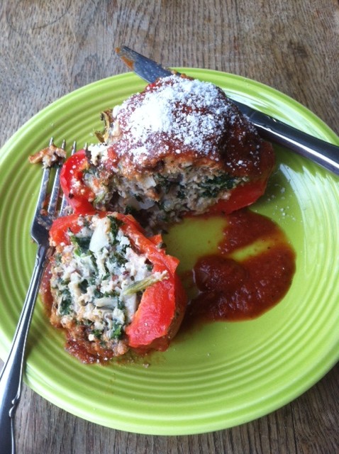 Dinner! A delicious Greek Style Quinoa Chicken Stuffed Pepper! Perfect with a little marinara sauce over the top!! Yummy and filling and LOOOWWWWW in calories! Only 209 for the whole thing! Gotta love a good recipe!