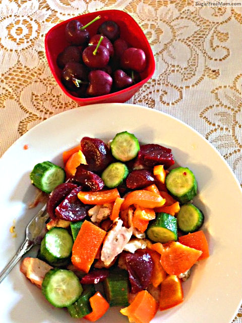 An easy lunch of peppers, cucumbers, beets, and some grilled chicken and a side of fresh cherries!