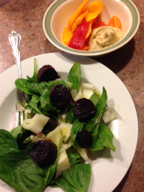 Lunch was a quick salad with spinach, fennel, beats and peppers and hummus on the side. Easy, fast and enough.